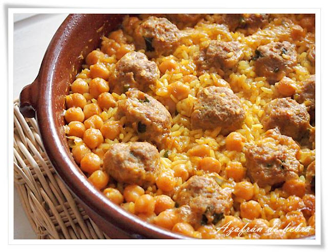 - Vertemos el caldo con las albóndigas, si el caldo no lleva azafrán de hebra le ponemos unas hebras y cuando el conjunto hierva fuerte metemos la cazuela en el horno que estará bien caliente, a 200º, 18 minutos, hasta que quede seco.